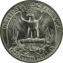 The new clad quarters were struck without mint mark in 1965–1967, regardless of the mint of origin. Beginning in 1968, mint marks were used again, except that Philadelphia continued to issue coins without them. The San Francisco Mint had reopened, but from 1968, it struck quarters only for collectors, for the most part proof coins.[37] The Mint adjusted both sides of the coin for the initiation of clad coinage, lowering the relief (the modified reverse design exists on some 1964-dated silver quarters). The obverse was slightly changed in 1974, with some details sharpened.[38] Mint marks on post-1967 pieces are found on the lower right of the obverse, to the right of Washington's neck.[39]