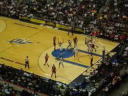 A contest was held to choose a new name and the choices were narrowed to the Dragons, Express, Stallions, Sea Dogs, and the Wizards.[92] On May 15, 1997, the Bullets officially became the Wizards. The new name generated some controversy because "wizard" is a rank in the Ku Klux Klan, and Washington has a large African American population.[92] A new logo was unveiled and the team colors were changed from the traditional red, white and blue to a lighter shade of blue, black and bronze, the same colors as the Washington Capitals of the National Hockey League (NHL), also owned by Pollin and changed from red, white and blue before the 1995–96 season. Washington forward Juwan Howard sat on the committee that decided on the logo design.[93] That same year the Wizards moved to the then MCI Center (Capital One Arena), also home to the Capitals and the Georgetown Hoyas men's college basketball team.[94]