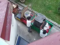 Mexico City residents must haul their trash to a waste collection vehicle which makes frequent stops around each neighborhood. The waste collectors will indicate their readiness by ringing a distinctive bell and possibly shouting. Residents line up and hand their trash container to the waste collector. A tip may be expected in some neighborhoods.[1] Private contracted waste collectors may circulate in the same neighborhoods as many as five times per day, pushing a cart with a waste container, ringing a bell and shouting to announce their presence. These private contractors are not paid a salary, and survive only on the tips they receive.[1] Later, they meet up with a waste collection vehicle to deposit their accumulated waste.