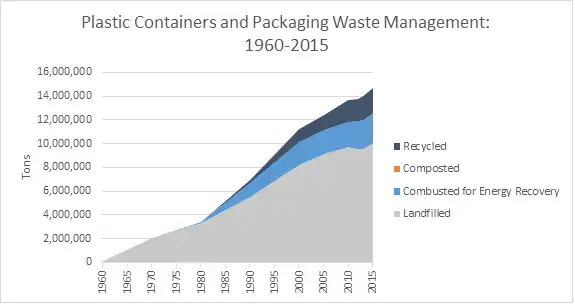 Plastic containers and packaging can be found in plastic bottles, supermarket bags, milk and water jugs, and more. EPA used data from the American Chemistry Council to estimate that 14.7 million tons (5.5 percent of MSW generation) of plastic containers and packaging were created in 2015.[5] The overall amount that is recycled is about 2.2 million tons (14.6 percent).[5] In addition, 16.8 percent were combusted with energy recover and 68.6 percent went straight into the land fill.[5] Most of the plastics are made from polyethylene terephthalate (PET), high-density polyethylene (HDPE), low-density polyethylene (LDPE), polyvinyl chloride (PVC), polystyrene (PS), polypropylene (PP) and other resins.[5] That being said, the recycling rate for PET bottles and jars was 29.9 percent (890,000 tons) and the recycling of HDPE water and milk jugs was 30.3 percent (230,000 tons).[5]