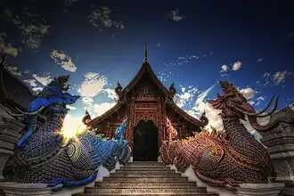 Wat Den Sali Si Mueang Kaen (วัดเด่นสะหลีศรีเมืองแกน), also known as Wat Ban Den (วัดบ้านเด่น), is a Buddhist temple located in Inthakhin, Mae Taeng district, Chiang Mai Province, Thailand. Known for its stunning architecture, the temple is a blend of traditional Lanna style and intricate modern craftsmanship.[1] Situated on a small hill overlooking the village, this sacred site was once centered around a cave highly revered by the local community.[2]