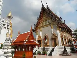 The temple has an ordination hall called the Ubosot (prayer hall) also known linguistically as Bod. Its architecture reflects the style followed during the Ayutthaya Kingdom. It was refurbished in 1982. Italian marble is used to decorate the lower part of the hall and the walls are decorated with traditional paintings.[1] The sema boundary posts marking the limits of the Ubosot are mounted over small naga images. The murals on the walls have the theme of the daily life. There is also a practice at this venue to make and sell amulets.[4]
