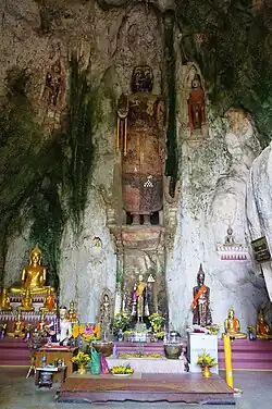 Luang Pho Dam was built in the late Dvaravati period or longer than one thousand years ago. When it was first built, it was coloured in black using black colour from betel palm, hence the name "Luang Pho Dam" (reverend father black). Time faded the black colour away so today the colour is pale reddish brown. The lower part from the waist down to the foundation, was carved from a piece of stone that to the cave's wall. While the upper part was carved from a piece of sandstone. Luang Pho Dam can be obviously seen that Gupta art from India influenced the characters such as it has thick lip, curly hair and big head. At it ankles were chains. Legendarily that at dusk it would often leave the cave to woo young women. The villagers had to tether it.[1]