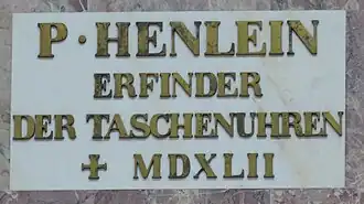 The Walhalla in Donaustauf, which is a memorial for "politicians, sovereigns, scientists and artists of the German tongue",[58] honors Peter Henlein with the words inventor of the watch.[g][59]