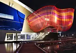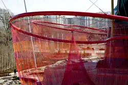 Water Sky Garden is a sculptural environment designed by artist Janet Echelman. The garden is located outside the Richmond Olympic Oval, an official venue for the 2010 Vancouver Olympic Games. The installation consists of a wetland treatment pond, 300 ft. boardwalk, two 52 ft. pedestrian bridges, two net sculptures, and a fountain.