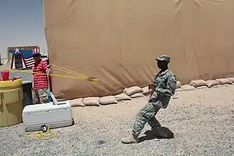 A water balloon launcher or water balloon slingshot is a catapult toy that shoots water balloons significantly further than hand-throwing[8] and is used in some water balloon fights. Both home-made and commercially sold models exist, with stationary, mobile, and multi-person-operated types available.[9] Even though water balloon launchers are mainly marketed towards children, adults also engage in water balloon activities.[10] Some water balloon launchers are capable of launching water balloons further than 300 yards (274 metres).[11]