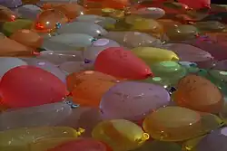 A water balloon or water bomb is a balloon, often made of latex rubber, filled with water. Water balloons are used in a summer pastime of cooling off through water balloon fights. Water balloons are also popular for celebrations, including celebrating Holi and Carnival in India, Nepal, and several other countries.[1]