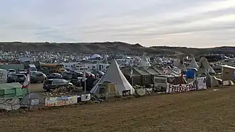 Actions have involved traditional direct actions like blockades on reserve lands and traditional territories to block corporations from engaging in resource extraction.[3] Water and land protectors have also created resistance camps as a way to re-occupy and refuse to give away their traditional territories. Usually part of these encampments, when led by Indigenous people, is a strengthening of cultural ties and traditions, with inclusion of activities like language revitalization.[14][15] They also take actions outside of protesting that are rooted in ceremony. These actions include singing songs to water, offering tobacco to water, and praying to the water.[5] Such actions reflect the importance that water holds to these communities.[16]