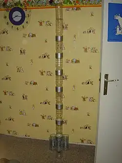 The Guinness World Record for the largest water rocket, measuring 7.72 metres (25.3 ft) tall and 72.5 centimetres (28.5 in) in diameter, is held by the NPO Showa Gakuen (Japan). It was presented, measured and launched on 2 June 2022, in Taiki, Hokkaido, Japan.[22] The previous record holder was National Physical Laboratory (United Kingdom) with a water rocket measuring 3.40 metres (11.2 ft) tall and 40 centimetres (16 in) in diameter. It was presented, measured and launched on 15 June 2011.[23][10]