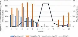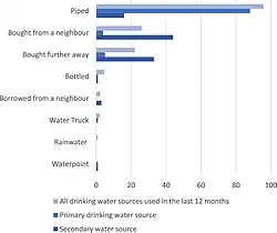 Water in Wukro has been a scarce resource due to urban population growth, construction, and the seasonality of water availability.[42] Climate variability is a driver of water access in Wukro, with greater access to water during the wet season, particularly July to September. In the dry season, around 43%–45% of households rely solely on piped water to meet domestic water needs, which is mostly supplemented with buying water. In the wet season, just over half of households rely on piped water only for drinking and cooking, while rainwater is used widely for washing clothes, cleaning and bathing; a smaller proportion of households still rely on bought water for drinking and cooking.[17]