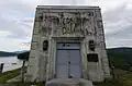 Structure on top of the Waterbury Dam, with a plaque by the door -