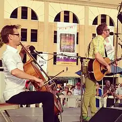 Michele Schroder, Director of Entertainment, learning that The Barenaked Ladies appeared at the 2nd Waterloo Busker Carnival (before they coincidentally had a name) was on a mission to have them kickoff the 25th anniversary of the Carnival. This led to talks with former BNL front man, Steven Page, and early in 2013, the contract was signed.[10] On Thursday, August 22, 2013 at 6:30pm, Steven Page performed for a packed Waterloo Public Square and launched the 25th anniversary with a one-hour-long free concert. Supported by Canadian cello player and composer, Kevin Fox, Steven Page performed BNL favourites that he authored as well as new songs from his solo act.[11] Steven Page would later return for the Carnival's 30th Anniversary.