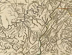 - ^ Canoe landings of the fur trade were sometimes confused because of "word-of-mouth". But Charegree the Indian's map (Library of Congress) of about 1755 shows the upper Shawnee Town at the mouth of the Great Kanawha River. Hanna, in his book titled The Wilderness Trail, published in 1911, quotes on page 142 "Dr. Thwaites, in a note to Wither's Chronicles of Border Warfare, states that the Upper Shawnee Town (which a troop of Virginia militia—The Big Sandy Expedition—vainly tried to find in 1756) was an Indian village at Old Town Creek, emptying into the Ohio from the north, 39 miles (63 km) above the mouth of the Great Kanawha." There is to this day an Old Town Creek in Meigs County, Ohio. But it is not quite 39 miles (63 km) above the mouth of the Kanawha River. This has to do with La Tort's family and trade. Cheregree shows an unnamed dot at about the location of Old Town Creek in Mason County, West Virginia, which was not an important enemy village or a major concern of the French and Indian War. Just below it on his intelligence report map, the Upper Shawnee Town is shown at the very point of the Great Kanawha named as such. The Sauvanoos had removed from the area of Fort Duquesne. Much of Virginian Major Lewis' 1756 Big Sandy expedition was trooped by Virginia Cherokee. Andrew Montour mustered a few Virginia "Cherokee" for George Washington in 1754. Recent scholars identify these as Tuscarora which is likely closer to who they really were, a mix of similar language of whom certain settlers reckon any hill Indians in broad sense as simply "Cherokee".