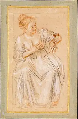 Watteau was a prolific draftsman. His drawings, typically executed in trois crayons technique, were collected and admired even by those, such as count de Caylus or Gersaint, who found fault with his paintings.[4] In 1726 and 1728, Jean de Jullienne published suites of etchings after Watteau's drawings, and in 1735 he published a series of engravings after his paintings, The Recueil Jullienne.[4] The quality of the reproductions, using a mixture of engraving and etching following the practice of the Rubens engravers, varied according to the skill of the people employed by Jullienne, but was often very high. Such a comprehensive record was hitherto unparalleled.[4] This helped disseminate his influence round Europe and into the decorative arts.
