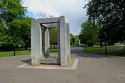 In 2001, the sculpture ‘Enclosure’ by Paul de Monchaux was added to the park. The four metre high stone sculpture frames three skyline landmarks in and around the park. These framed structures are named on the base of the sculpture, with it framing the Cenotaph (though this is blocked by the Issac Watts statue), the Southampton Civic Centre clock tower and the Spire on what was formerly St Peters Church, opposite the Mayflower Theatre. It was paid for by the Lottery Fund.[27][28]