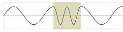 Localized wave packets, "bursts" of wave action where each wave packet travels as a unit, find application in many fields of physics. A wave packet has an envelope that describes the overall amplitude of the wave; within the envelope, the distance between adjacent peaks or troughs is sometimes called a local wavelength.[21][22] An example is shown in the figure. In general, the envelope of the wave packet moves at a speed different from the constituent waves.[23]