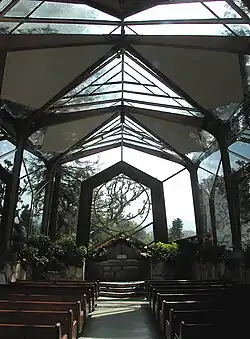 The 100-seat church was designed by Lloyd Wright (son of Frank Lloyd Wright) in the late 1940s and was built between 1949 and 1951, at a cost of $25,000.[1] Additions were built in later years, including a tower and a visitor center, the latter of which had been lost in a landslide during the 1960s.[2] Because of its scenic location, the church is popular for weddings.[3] In 1999, the chapel hosted 800 weddings.[1]