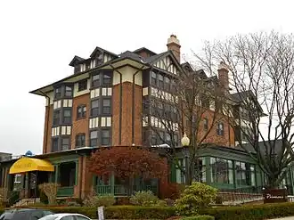 Built in 1906, this historic structure is a five-story, Tudor Revival building, with a two-story rear extension. It is built using brick and stucco with false Half Timbering and features a one-story, wraparound porch with a semi-circular dining projection and two projecting bay windows that extend from the second to fourth floors.[2]