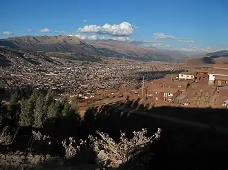 ![]() Cusco with the mountains Pillku Urqu (on the left), Pachatusan (center) and Huaypun in the background | |