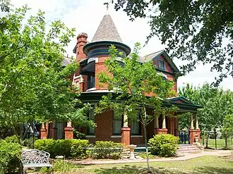 Queen Anne-style houses are not often constructed of brick, but this one is, with brick laid in common bond. The house also shows Colonial Revival influences.[2]