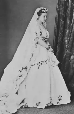Princess Helena, the fifth child and third daughter of Queen Victoria, wore a dress of white satin featuring deep flounces of Honiton lace, the design of which featured roses, ivy, and myrtle, for her marriage to Prince Christian of Schleswig-Holstein on 5 July 1866 at Windsor Castle, Windsor, Berkshire, England. Her headpiece was composed of orange blossom and myrtle, and the veil was also made of Honiton lace.[1] She also wore a necklace, earrings, and brooch of opals and diamonds, a wedding gift from the Queen. Along with bracelets set with miniatures, Helena also wore the Order of Victoria and Albert.[2]