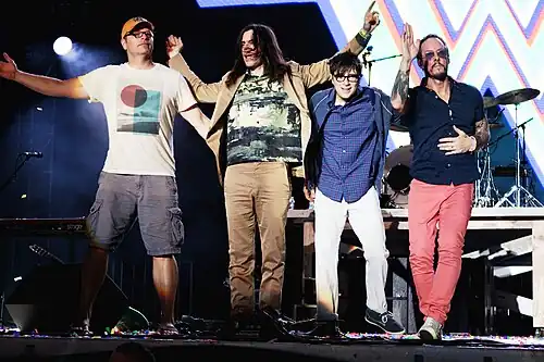 Weezer is an American rock band formed in Los Angeles, California, in 1992. Since 2001, the band has consisted of Rivers Cuomo (lead vocals, guitar, keyboards), Patrick Wilson (drums, backing vocals), Brian Bell (guitar, keyboards, backing vocals), and Scott Shriner (bass guitar, keyboards, backing vocals). They have sold 10 million albums in the United States and more than 35 million worldwide.[1]