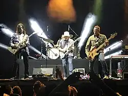 Weezer's music is generally characterized by loud guitars, abundance of hooks, and perceived nerdiness. According to Stephen Thomas Erlewine of AllMusic, the band's style "merges the heavy power pop of arena rockers like Cheap Trick and the angular guitar leads of the Pixies while injecting their melodies with doses of '70s metal."[249] Throughout its career, Weezer has maintained what has been described as a "heavy, guitar-oriented sound [played] over a steady, danceable groove."[250] The band's early material, such as the material on its debut album, was said to have "embodied the self-awareness of the intelligent alternative rock slacker." According to Tim Sendra of AllMusic, the group's debut album "fuses the raucous energy of punk, the loser-friendly geekiness of indie rock, the guitar power of grunge, and the huge hooks of radio rock [combined with] some heavy metal guitar heroics."[251] The sound present on the band's second album, Pinkerton, has been described as "darker [and] messier" than its predecessor.[252][253] Green was considered to be a return to the "tight" pop sound of Weezer's debut album.[254] According to Erlewine, Maladroit features "a tougher sound -- nowhere near as raw as Pinkerton, yet similarly loud and raucous, overflowing with guitars spitting out riffs and solos with a gleeful abandon."[255] 2005's Make Believe was considered to be a "return to [the] musical, emotional bloodletting" of Pinkerton.[256] On Red, the band began to incorporate longer song forms.[257]