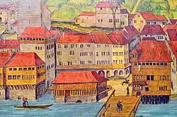 In 70/75 AD a harbor district rose on the newly acquired lands on the Limmat riverbank at the foot of the former Oppidum Lindenhof at the Schipfe–Weinplatz area, and the settlement area of the Gallo-Roman Turicum was extended on the right bank of the Limmat at the present Limmatquai. Public buildings made of stone and paved roads were built. Suggested by the recent archaeological evidence uncovered during construction at Münsterbrücke, the present Weinplatz may have been the site of the civilian harbour of the Celtic-Roman Turicum.[3] At the site of the present Weinplatz towards St. Peterhofstatt the remains of remarkable 2nd to 4th century AD Thermae were excavated.[4]
