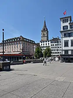 Being part of the ancient Kornhausplatz (Rathhausbrücke) plaza, Weinplatz was used as a grain and vegetable store in medieval times, and became in 1630 the public market for local wines, the present Weinplatz square. Despite the relocation of the market to the Münsterhof plaza in 1647, the name is still the same.[5] Some medieval sources mention the Rother Turm building, meaning the "red tower" which was used by the House of Rapperswil as its seat in Zürich in the early 13th century; much later it became a 'literature café' and was demolished. Weinplatz now is a popular tourist destination, nearby the Münsterhof plaza, and it is the location of some small shops and cafés.