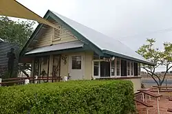 The name "Williams Camp" was replaced by "Wellcamp" c. 1878; apparently because there was a well at the construction camp.[17][18] However, the name Wellcamp was not used in Pugh's Almanac and Directory until 1883, referring to the railway station.[19][20] A number of facilities were erected at or near the Wellcamp railway station over time, including a cottage for the gatekeeper, a station building, weighbridge and goods shed (c. 1883), loop siding, stockyards and loading bank.[21] The Wellcamp Hotel opened in 1908 and was offered for sale in 1922.[22][23] A small reinforced-concrete factory for cheese making was opened in 1917 by the Standard Dairy Co. of Brisbane, as an "auxiliary" to the company's condensing factory at Wyreema.[24] The cheese factory was closed in 1942, but was still extant at 2019.[25][1]