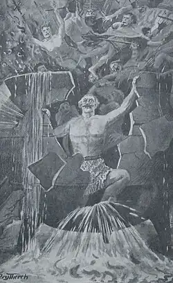 Claude Sterckx proposes that Celtic mythology hints at a cyclical cosmogony given a key commonly repeated story pattern: a man (hero/king) and woman (earth or sovereignty goddess) face a rival for the woman's affection before uniting to birth a son who represents the life of the world; ultimately these figures die to create space for the cycle to repeat.[4] For instance, the names of certain Welsh mythological figures point to this pattern, as John Koch suggests that Gwron ("divine husband") and Modron ("divine mother") united to create Mabon ("divine son").[5] This pattern occurs in The Mabinogion as well, with Pwyll and Rhiannon facing the rival Gwawl before uniting to conceive Pryderi. In both Mabon and Pryderi's cases, the divine son is taken by force soon after birth, with the divine parent(s) needing to wait years before ultimately reuniting with the son.