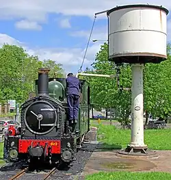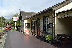 A group of volunteers and enthusiasts took the line over and started raising money to preserve and restore it. On 6 April 1963 the first section of the line was re-opened as a tourist railway. The line through the streets of Welshpool however could not be reopened, and so the Cambrian station at Raven Square was redeveloped on the western edge of the town, opening on 18 July 1981.[1] The new station building was obtained from Eardisley in Herefordshire and is a historic example of a type once prepared from a wooden kit, similar to many built on rural lines. Also, a water tower built over 100 years ago was obtained from Pwllheli station. Also at Raven Square is a display shed which houses steam locomotive Monarch, a static exhibit, plus several other items of rolling stock. At Raven Square passengers can disembark, watch the locomotive take on more water and run round the carriages.
