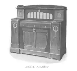 The firm was already famous for its inventions in the field of the reproduction of music when Welte introduced the Welte-Mignon reproducing piano in 1904. "It automatically replayed the tempo, phrasing, dynamics and pedalling of a particular performance, and not just the notes of the music, as was the case with other player pianos of the time." In September, 1904, the Mignon was demonstrated in the Leipzig Trade Fair. In March, 1905 it became better known when showcased "at the showrooms of Hugo Popper, a manufacturer of roll-operated orchestrions". By 1906, the Mignon was also exported to the United States, installed to pianos by the firms Feurich and Steinway & Sons.[1] As a result of this invention by Edwin Welte (1876–1958) and his brother-in-law Karl Bockisch (1874–1952), one could now record and reproduce the music played by a pianist as true to life as was technologically possible at the time. Pianists who recorded for Welte-Mignon included Anna Schytte.[2]