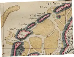 West-Vlieland (also known as Westeyende) (West Frisian: West-Flylân) was a village on the island of Vlieland in the province of Friesland, the Netherlands. It was gradually lost to the advance of the sea, by 1736 only two houses remained. The site of the village was in 1857 15 fathoms (27 m) below sea level.[2] The village had its own town hall, church, school, poorhouse and a mill which was built in 1647[3] and by 1670 it had between 2.000 and 2.500 inhabitants, making it a large and prosperous village.[4] Half a century later it counted only 750 people.[4] Many of the inhabitants worked on the seas, whaling or trading on the Baltic Sea. At the beginning of the seventeenth century, the town had a famous bar and a military storage.[4] At the end of the 17th century the village began to decline: in a few decades the plague visited the village multiple times, sailors were increasingly assailed by Dunkirker pirates, and the village began to be increasingly difficult to reach due to sand accumulation while the village itself was slowly devoured by the seas.[4] All of this led to East Vlieland increasingly outcompeting its neighbour until West-Vlieland disappeared entirely.[4]