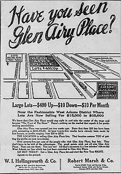 - Glen Airy Place - Glen Airy Place was a residential subdivision advertised as "near the fashionable West Adams District". An official subdivision map gives the boundaries as Adams Street (now Adams Boulevard) on the north, Vancouver Avenue (now La Brea Avenue) on the east, Roseland Street on the south and Edgemar Street (now Cochran Avenue) on the west.[53]