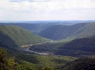 The river enters the valley after emerging from a deep gorge in the Allegheny Plateau above Lock Haven, then turns east entering a broad alluvial flood plain, where it receives the Bald Eagle Creek after passing the town. The flood plain lies at the foot of the Bald Eagle Mountain ridge, with large fertile farm fields in and around the river's meanders and islands. The valley above the flood plain is a series of knolls below the plateau. Further down the valley, the river receives Pine Creek which has also entered the valley from a deep gorge, Pine Creek Gorge (also known as the Grand Canyon of Pennsylvania). East of Williamsport, the Bald Eagle ridge ends, the river turns south, and the valley opens up and follows the river to the water gap at Lewisburg.