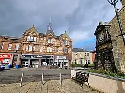 The village has a long association with several Cooperative organisations, now defunct.[13] There were several early cooperative associations in the village, known as friendly societies, which were founded in 1799 and 1812, however they eventually ceased operation.[5] The principal West Calder Co-operative Society (WCCS) was founded in 1875 by a group of shale miners.[13] The former WCCS Co-operative building of the town at 13 to 19 Main Street was built in 1913 to a design by William Baillie. It is Category B listed, stone fronted with an unusual ironwork crown and two crowstepped gables.[3][14] Two previous cooperative buildings existed in the town; the Peoples Palace and clocktower was replaced by the Royal Bank in 1885 to a design by J G Fairley and another building demolished to make way for Union Square.[3][15] The former co-operative bakery building on Society Place was built in 1910.[15] The bakery in Society Place closed in 1982 when WCCS merged with Bathgate Cooperative Society.[13]