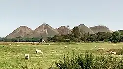 The 'Five Sisters' group of shale bings to the north of West Calder is a local landmark and scheduled monument.[30] The bings rise to a height of 230 feet (70 m) above the surrounding area, and are the spoil tips from the oil shale industry that was a feature of the area.[31] The Five Sisters were named by artist John Latham during his time with an Artist Placement Group project with the Scottish Office's Development Agency in 1975–6.[32]