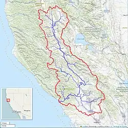 The Russian River (Southern Pomo: Ashokawna, Spanish: Río Ruso) (Russian: русская река) is a southward-flowing river that drains 1,485 sq mi (3,850 km2)[4] of Sonoma and Mendocino counties in Northern California. With an annual average discharge of approximately 1,600,000 acre feet (2.0 km3),[6] it is the second-largest river (after the Sacramento River) flowing through the nine-county Greater San Francisco Bay Area, with a mainstem 115 mi (185 km) long.