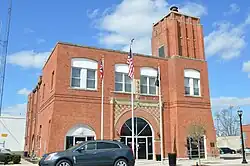 During 1893, the town hall was built,[20] which replaced the previous town hall built in 1855. The 1893 hall was the 3rd building to stand there. Originally, it was known as the "opera house",[21] due to it housing a movie theatre until sometime in the 1930's or 40's. In 1958, the top few stories (most likely 3 or 4) were removed due to structural instability.[22] Oddly, on a cornerstone of the building, the message inscribed calls the town hall the city hall. It is unknown why that was inscribed.