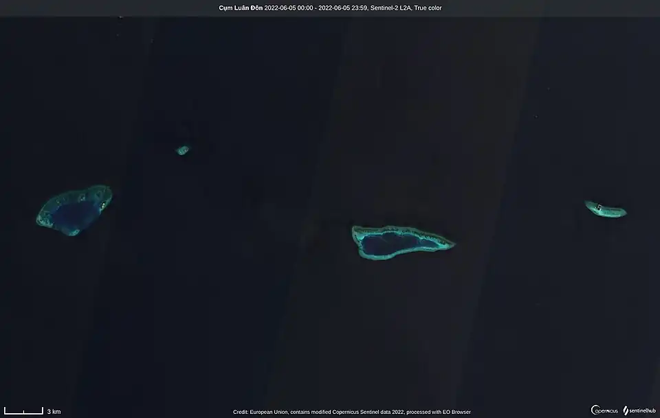 - Da Tay A Island: 8°52′00″N 112°15′25″E / 8.86667°N 112.25694°E (8°52′00″N 112°15′25″E / 8.86667°N 112.25694°E), [Chinese: 西礁东岛; pinyin: Xījiāo Dōngdǎo[5]], as known as West Reef East Island,[6] is an island located on the east side of West London Reef, with a significant floating land area lying on the opposite side of the island. northwest of West stony atoll. According to the Center for Strategic and International Studies (CSIS, USA), Vietnam has rehabilitated 28.5 hectares including reclaimed land and dredged coral foundation for ship locks.[7] According to satellite images LandLook (USGS, USA), the current floating land area of this island is about 11 hectares (0.11 km2).[8]