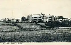 The Immigrants Home was founded by Caroline Chisholm in East Maitland and was the first public building that was used to treat the sick.[32] The site eventually became known as Maitland Benevolent Asylum.[32] In 1835, when the population hit 1900, residents started to petition for a new hospital.[32] In 1843 a meeting was called to discuss applying to Benevolent Asylum in Sydney.[32] A committee was formed and succeeded in obtaining a grant of £1000 for a new hospital on 5 December 1844.[32] In April 1845 Sir George Gipps approved a grant of a site at Campbell's Hill, West Maitland opposite Boyne's Inn.[32] The foundation stone was laid by Edward Denny Day on 26 January 1846.[32] In April 1846 the foundation stone was removed and was never recovered.[32] In September 1847 the Building Committee announced that plans for the building of the new hospital would be accepted.[32] The cost of the building was not to exceed £2000 and fifteen guineas would be awarded to the party furnishing the approved plan.[32] By May 1848 the Maitland Mercury was reporting that the walls of the new hospital were visible from the town.[32] Opened in 1850 its first years saw 231 patients and 26 deaths.[32] Between 1903 and 1905 saw the completion of the Ward Block 1 at the southern end of the hospital.[33] With the growth of population in the district, it was found that the accommodation was inadequate and a new building was erected and opened in 1905.[32] In 1916 a blood bank and isolation cottage were completed.[33] In 1926 the hospital became a training school for nurses.[33] New nurses' quarters which occupied the site of the old Royal Oak Hotel was built during the twelve months from October 1927 to October 1928.[32] In the 1930s Ward Block 3 was built and extensions were completed to the nurses home in 1932 and 1937.[33]