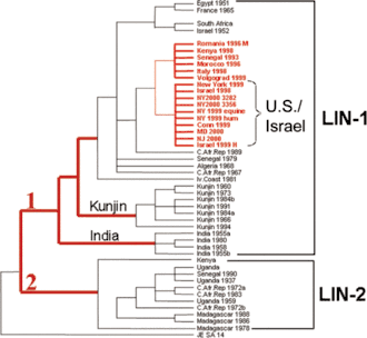 WNV is one of the Japanese encephalitis antigenic serocomplex of viruses, together with Japanese encephalitis virus, Murray Valley encephalitis virus, Saint Louis encephalitis virus and some other flaviviruses.[29] Studies of phylogenetic lineages have determined that WNV emerged as a distinct virus around 1000 years ago.[30] This initial virus developed into two distinct lineages. Lineage 1 and its multiple profiles is the source of the epidemic transmission in Africa and throughout the world. Lineage 2 was considered an African zoonosis. However, in 2008, lineage 2, previously only seen in horses in sub-Saharan Africa and Madagascar, began to appear in horses in Europe, where the first known outbreak affected 18 animals in Hungary.[31] Lineage 1 West Nile virus was detected in South Africa in 2010 in a mare and her aborted fetus; previously, only lineage 2 West Nile virus had been detected in horses and humans in South Africa.[32] Kunjin virus is a subtype of West Nile virus endemic to Oceania. A 2007 fatal case in a killer whale in Texas broadened the known host range of West Nile virus to include cetaceans.[33]