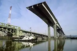 On June 11, 1978, a ship struck the old bridge, which left it open and unrepairable. Because of this, the project qualified for funds from the federal Office of Special Bridge Replacement. However, with many other damaged bridges to replace, this program alone did not have sufficient funding. While federal lawmakers were opposed to appropriating funds to a high-level bridge, Seattle City Council member Jeanette Williams, who served on the council from 1970 to 1989, lobbied Congress for the bridge and successfully secured funds with help from Senator Warren Magnuson.[13][14] The smaller Spokane Street Bridge which parallels it was built at the same time.