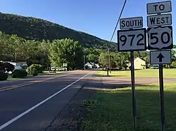 Route 972 began at the New Creek Wye in the community of Claysville, West Virginia at an intersection with U.S. Route 50. The highway progressed to the northeast, crossing through residences to the west and forests to the east, crossing Del Signore Farm Road and passing the New Creek School. Route 972 continued through the residences along the nearby mountainside, entering the community of New Creek after an intersection with Kings Run Road. The highway continued northward through New Creek, passing through the downtown farmland and continued its northeastern trek through the mountainside. As Route 972 curved to the north, it passed through downtown New Creek's large set of residences before intersecting with Meadowlark Acre Road and terminating at an intersection with U.S. Route 220 (Cut-Off Road).[3]
