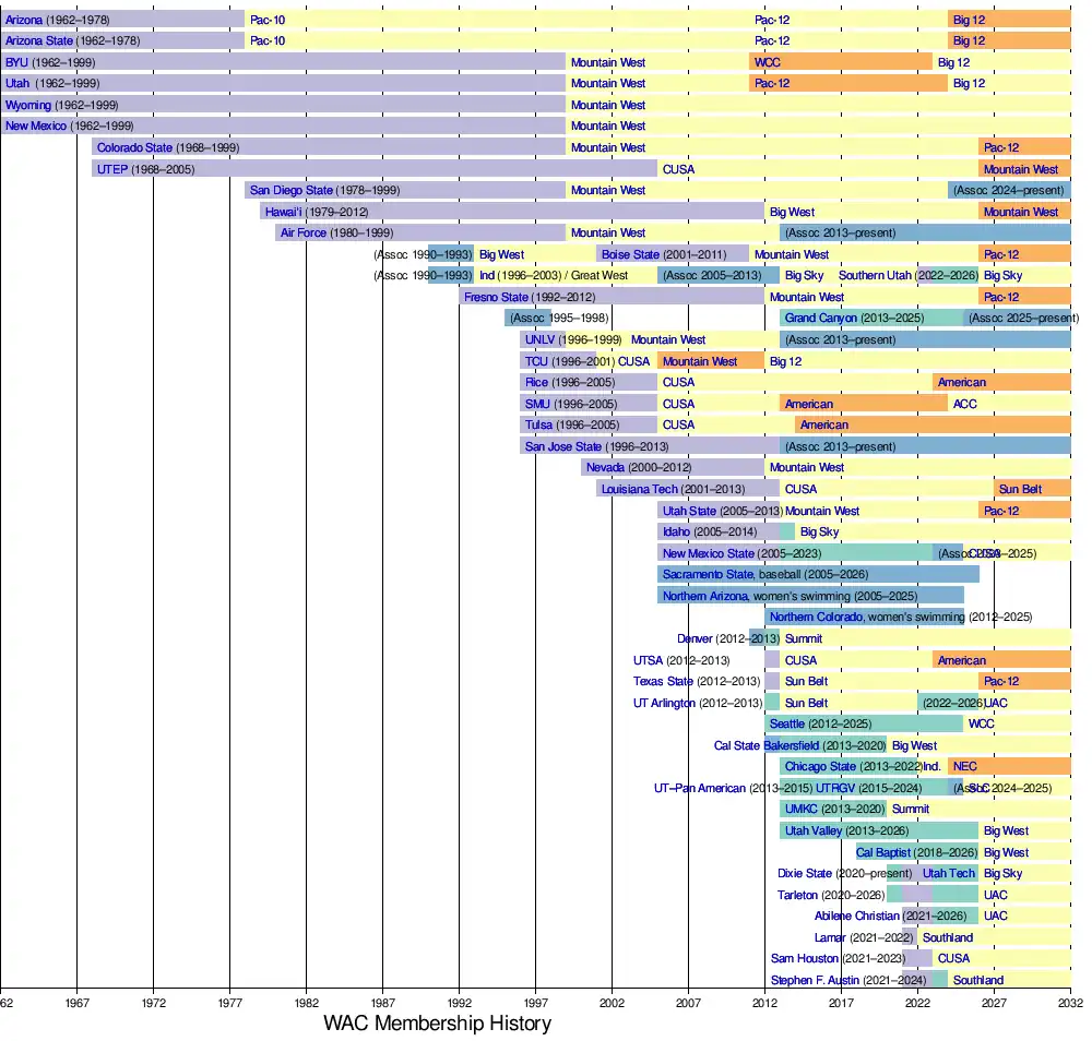 - ^ Sacramento State was formerly an associate member of the WAC in baseball from 1992–93 to 1995–96. It will leave the WAC in 2026 to join the Big West.