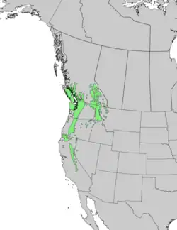 The species occurs in humid areas of the mountains of the Western United States and Western Canada[5] such as the Sierra Nevada, the Cascade Range, the Coast Range, and the northern Rocky Mountains. It can be found in elevations of 600 to 1,800 meters (2,000 to 5,900 ft) above sea level in eastern Washington and Oregon's Blue Mountains[5] and 1,800 to 3,100 metres (5,900 to 10,200 ft) on the western face of the Sierra Nevada as far south as the headwaters of the Kern River.[6][5] The tree often occurs in forests with fir and hemlock species, especially those which are tolerant of shade.[5] It benefits from disturbances that clear away competing species, including low fires that do not destroy all of its cone-protected seeds.[5] It is also well adapted to poor, rocky soils.[5]