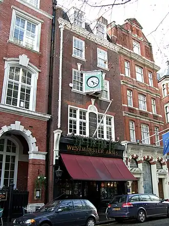 The Westminster Arms is a public house in the City of Westminster, Greater London, England. It is located on Storey's Gate, about 0.2 miles (0.32 km) west of the Palace of Westminster and near Westminster Abbey.[1]
