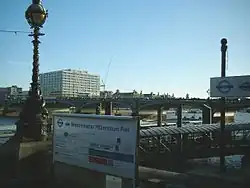 The development of Westminster Millennium Pier was funded by the Millennium Commission as part of the Thames project, and it was one of five new piers opened in 2000 by the Commission on the Thames (the others being Blackfriars Millennium Pier, London Eye Pier, Tower Millennium Pier and Millbank Millennium Pier). Its creation was funded by the project as part of an integrated transport and regeneration strategy for the Thames led by London's Cross River Partnership.[4]