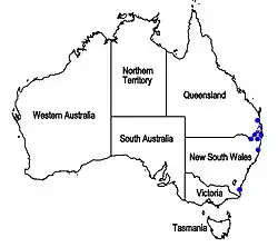 This westringia grows in wet sclerophyll forest and rainforest edges, often near streams or waterfalls in north-eastern New South Wales and south-eastern Queensland.[2]